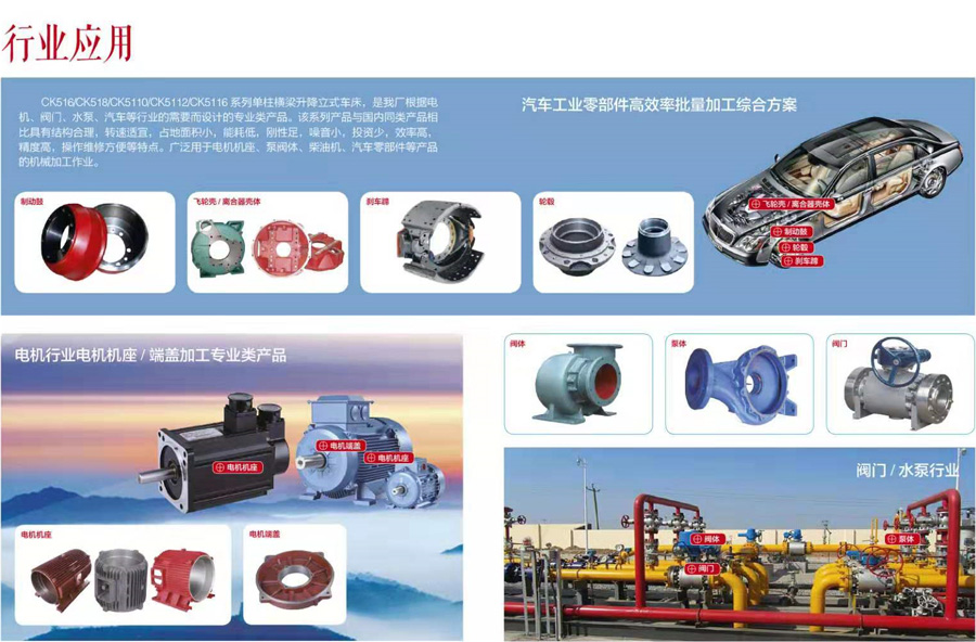 CK516/CK518/CK5110/CK5112/CK5116系列單柱橫梁升降立式車床,是我廠根據(jù)電機(jī)、閥門(mén)、水泵、汽車等行業(yè)的需要而設(shè)計(jì)的專業(yè)類產(chǎn)品。該系列產(chǎn)品具有結(jié)構(gòu)合理,轉(zhuǎn)速適宜,占地面積小,能耗低,剛性足,噪音小,投資少,效率高,精度高,操作維修方便等特點(diǎn)。廣泛用于電機(jī)機(jī)座、泵閥體、柴油機(jī)、汽車零部件等產(chǎn)品的機(jī)械加工作業(yè)。